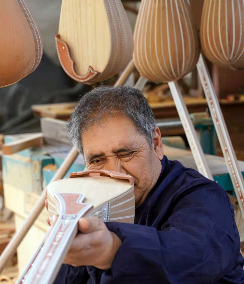 “合作社用了新设备,产量上去了,种类和花式也多了,现在一年能做2万把乐器。”合作社成员马穆提·热合曼说。他还是网络直播间的销售主播,和5名同伴在不同平台上边弹边唱,推介村里的乐器。