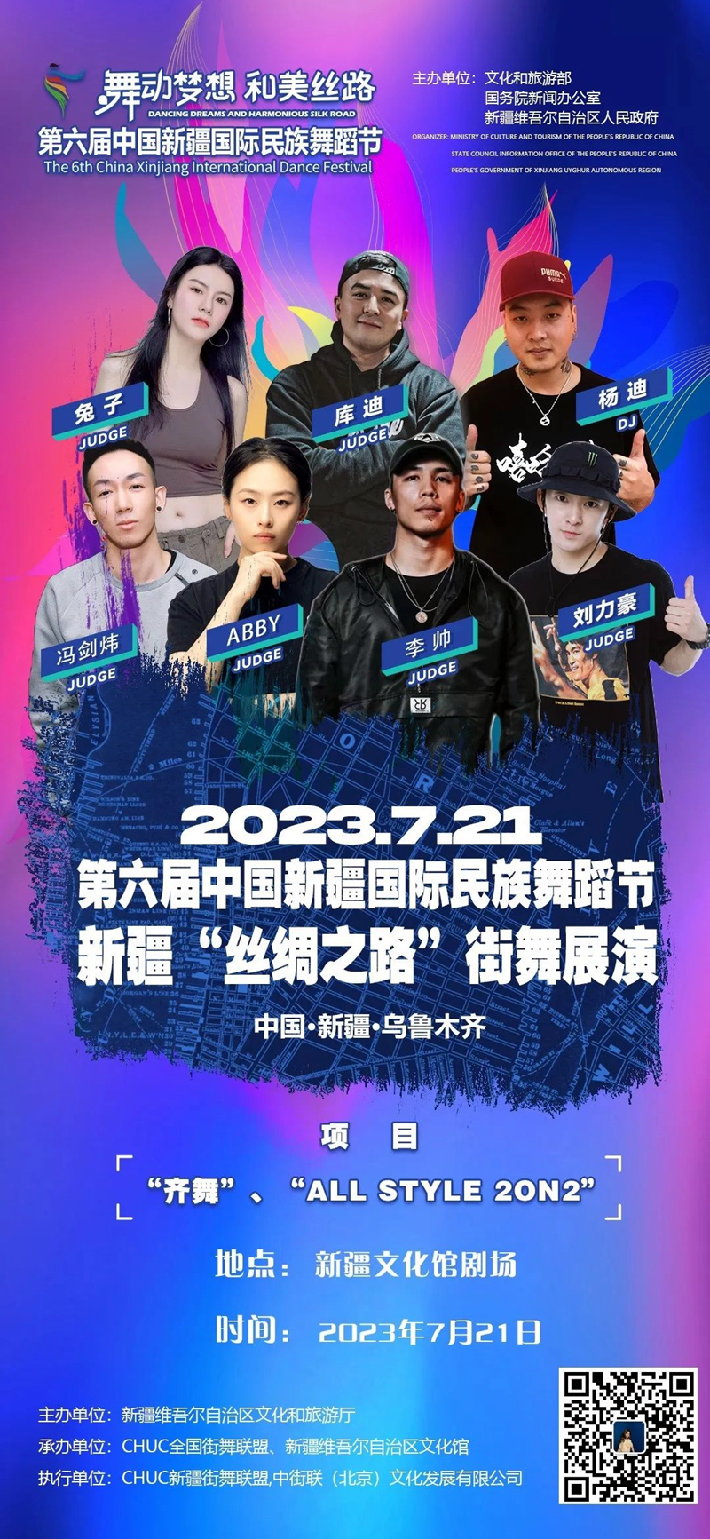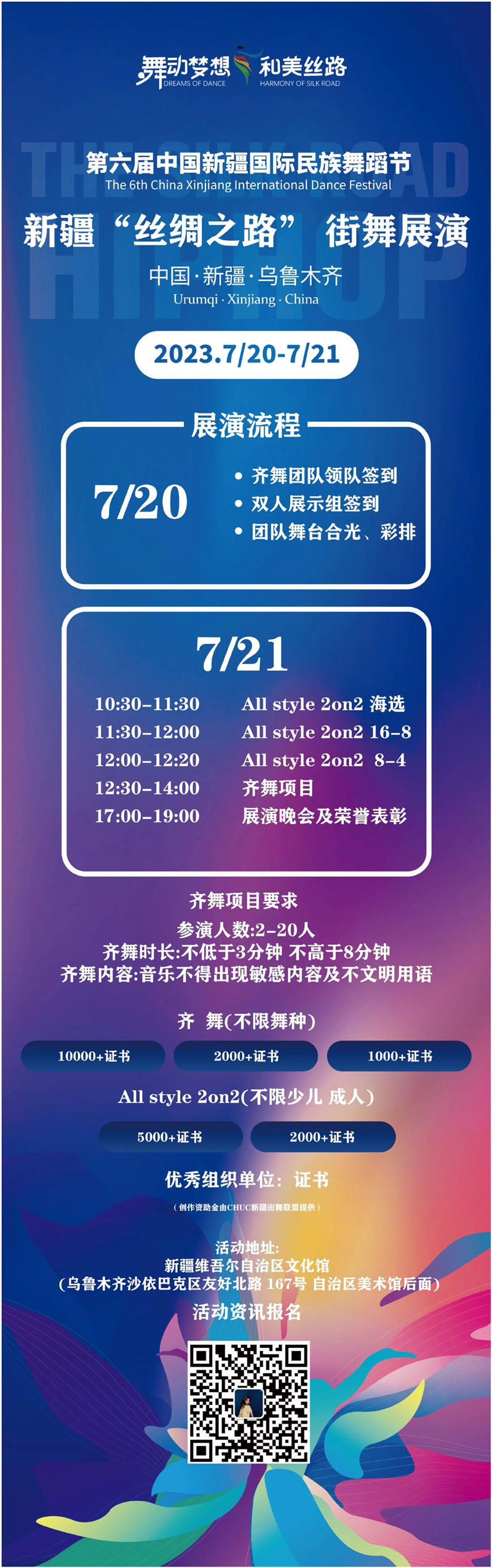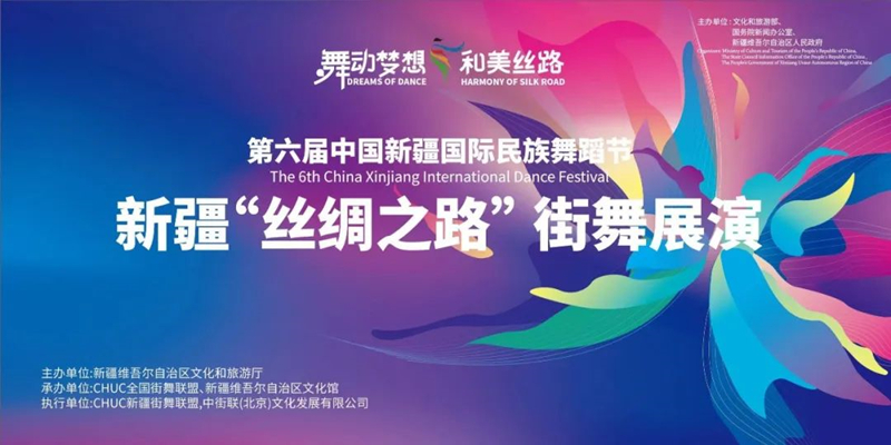 为实现“两个一百年”奋斗目标、实现中华民族伟大复兴中国梦提供强大的价值引导力、文化凝聚力、精神推动力,本次舞蹈节配套活动首次增加了街舞展演项目,由新疆维吾尔自治区文化和旅游厅主办,CHUC全国街舞联盟、新疆维吾尔自治区文化馆承办,CHUC新疆街舞联盟、中街联(北京)文化发展有限公司执行的“第六届中国新疆国际民族舞蹈节配套活动——新疆‘丝绸之路’街舞展演”活动将于7月21日在新疆维吾尔自治区文化馆剧场举办。