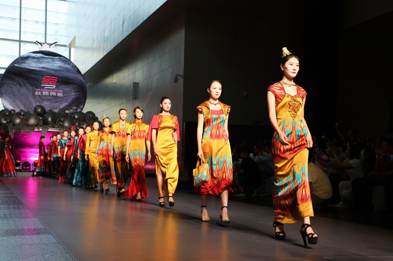 中国十佳时装设计师、新疆服装设计协会会长孙秀琴的“艾德莱斯随想”主题时装秀。新疆美术馆供图