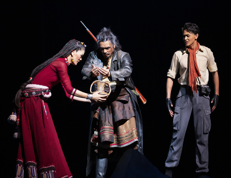 这部反映“生态保护、源头担当”的舞台艺术作品《大河之源》以第一人称为叙述视角,讲述着发生在中国“母亲河”源头的故事。“我”,一个来自沿海地区的游客,在探访河源文明的旅途中结识了当地巡山队长扎西和他的伙伴们,还有他美丽的女儿卓玛。在这里,“我”看见了记载中国最早舞蹈的彩陶,看见了清晨背星辰水的少女,寻访了“一江清水向东流”的河源,还有那些常年在这里守望着山水的质朴、善良、勇敢的人民。