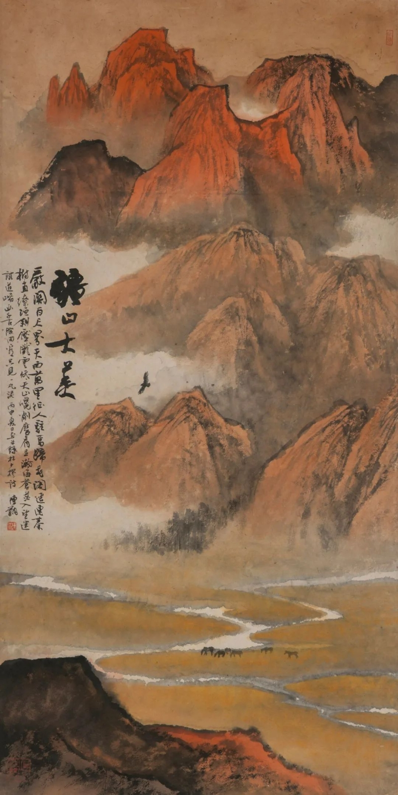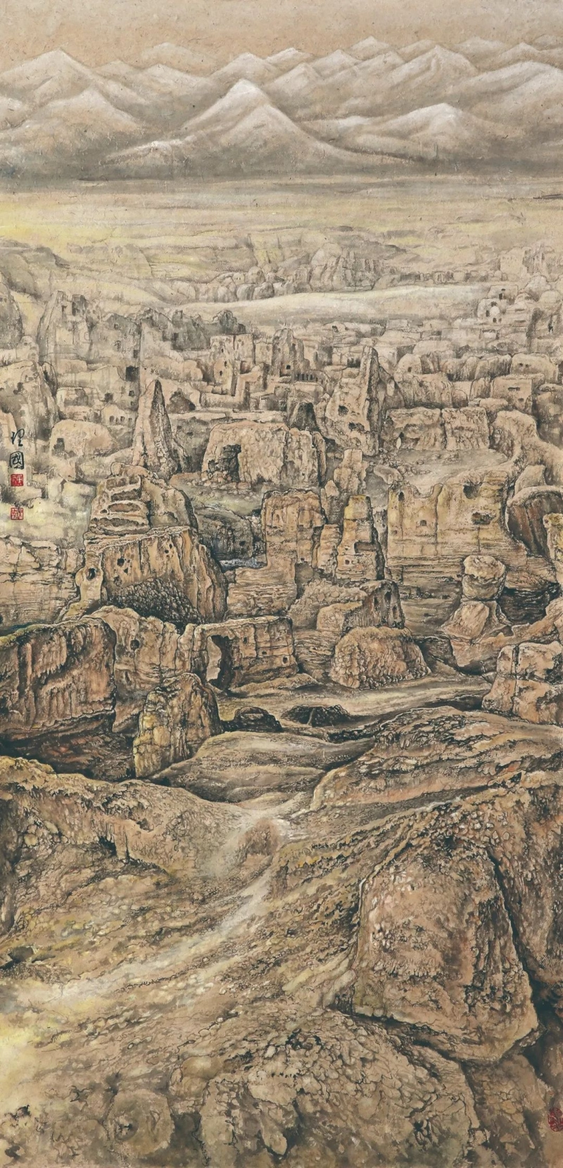 展览中有一系列以“天山”为主题的作品,比起传统国画中对雪山的表现多用留白,在桑皮纸上则用白色颜料勾勒晕染,非常厚实、壮美。其中,新疆大学书画研究院院长、新疆国画院副院长王钧兵的参展作品《天山春色》,就是利用桑皮纸独有的特性,巧妙地以水、墨、色反复叠加突出效果。
