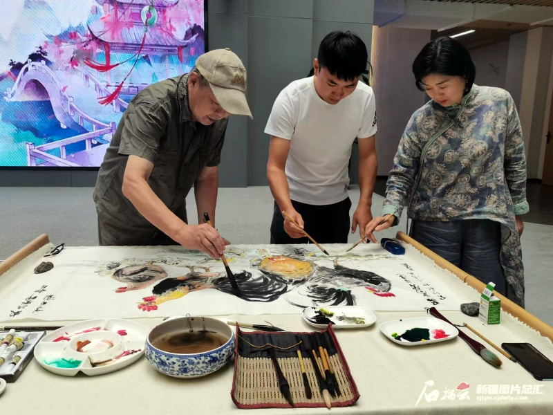 新疆润疆国画院院长魏宝山介绍,2021年,国画院策划实施《非遗新疆桑皮纸制作技艺》长卷项目,组织邀请中国美术家协会副主席何家英、画家黄理国等,历时一年完成16米长卷创作,并在疆内外举办巡回展览活动,得到社会各界好评,“我们组织邀请全国知名书画家来到沙湾,将用中华传统书画艺术记录、表现、传播、推广沙湾大盘鸡烹饪技艺,探索新疆特色非遗项目的创造性转化、创新性发展。”