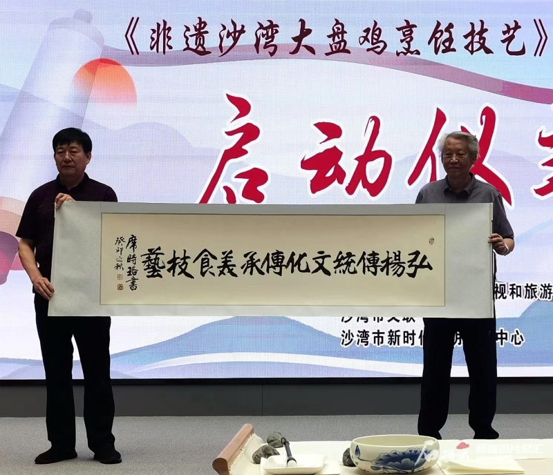 启动仪式上,新疆润疆国画院特聘画家、《非遗沙湾大盘鸡烹饪技艺》长卷主创黄理国开笔,并和沙湾市美术家协会会员共同创作国画作品《品高声自远》。88岁的新疆著名书法家席时珞为《非遗沙湾大盘鸡烹饪技艺》长卷题名,并向沙湾市题赠《弘扬传统文化 传承美食技艺》书法作品。