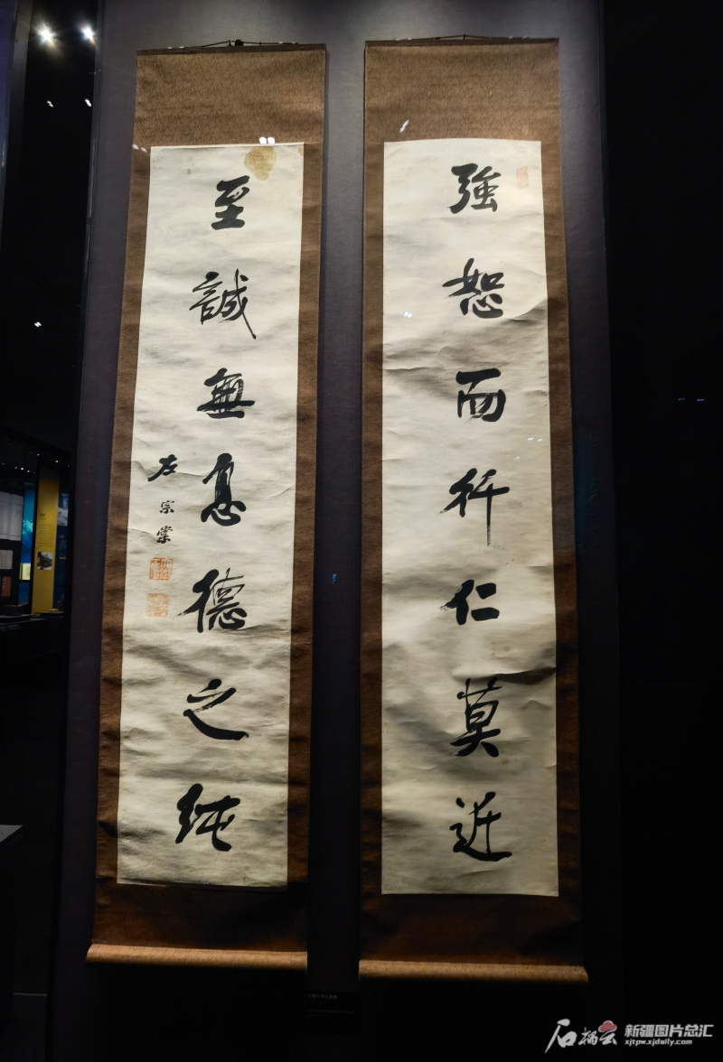 陈列在新疆博物馆《新疆历史文物展》中的左宗棠行书七言联。石榴云/新疆日报记者 银璐摄