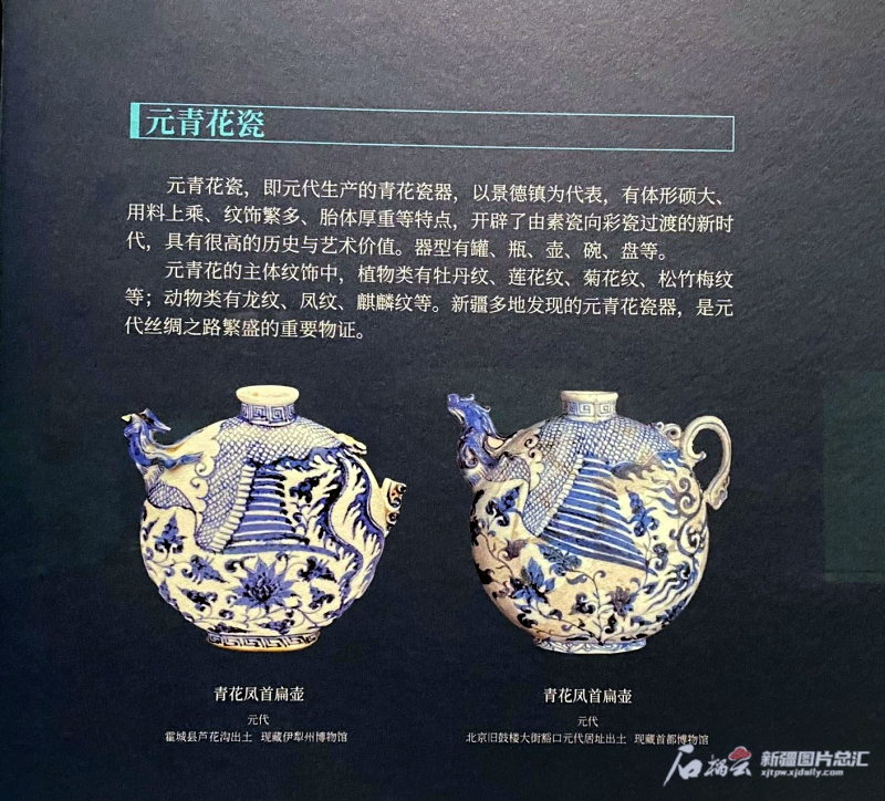 陈列于新疆博物馆的元代青花凤首扁壶(左边出土于新疆,右边出土于北京)。 石榴云/新疆日报记者 赵梅摄