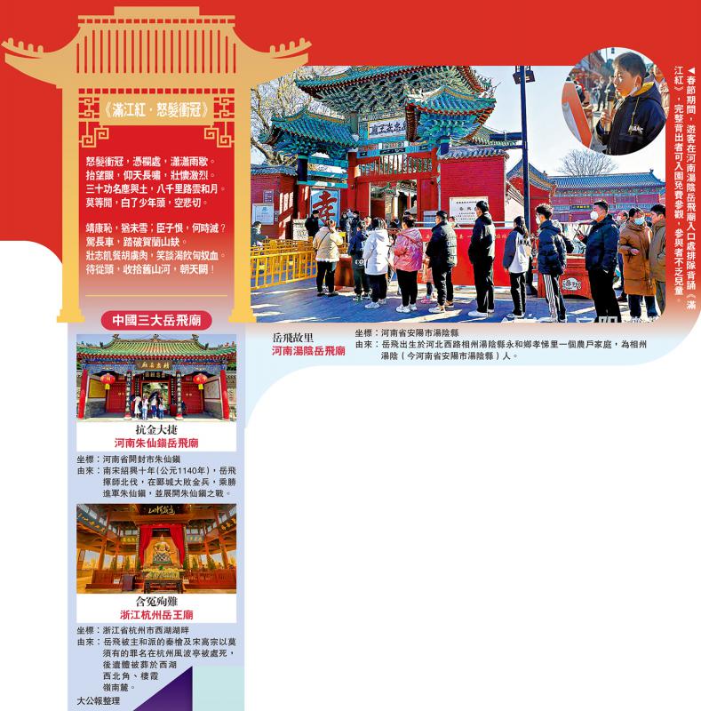 今年春节,张艺谋执导的古装喜剧电影《满江红》票房登顶内地春节档,位于河南省安阳市汤阴县的岳飞庙顺势成为了春节假期期间的网红观光地。地处岳武穆故里,汤阴岳飞庙景区更由1月26日起推出“完整背诵《满江红》,免费游岳飞庙”的宣传活动,短短两天就有4000余人挑战成功:“这个春节必须要来岳飞庙背一遍《满江红》,打一下秦桧。”